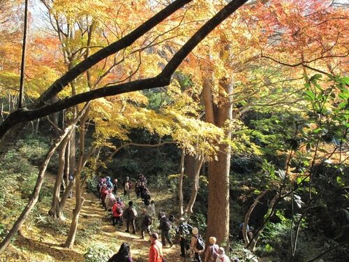 西東京市ウオーキング協会の12月例会は8日、JR大船駅から散在ヶ池公園~大平山~獅子舞渓谷~鶴岡八幡宮まで約11キロのコースで行われ、35人が紅葉の鎌倉を楽しんだ。 散在ヶ池(鎌倉湖)は江戸末期に造られた水田に引くため池。右の「馬の背の小径(こみ…