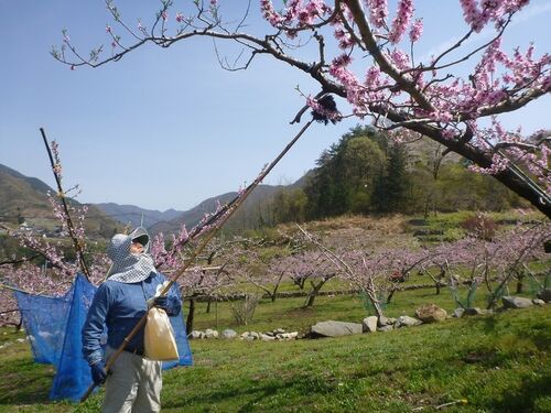 桃の産地、山梨県笛吹市で、桃の花の見ごろが今シーズン最後となりそうな御坂町上黒駒地区を4月13日、オートバイで訪ねた=写真は授粉作業。 中央道の一宮御坂インターチェンジから国道137号(バイパス)を河口湖方面へ向かい、旧道との交点から少し旧道…