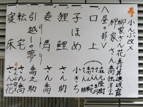 終演後に発表された演目 三鷹市芸術文化センターの落語会の1年を締めくくる柳家さん喬独演会が12月18日にあり、昼の部に足を運んだ。 独演会とはいえ、10番弟子の小んぶ改め柳家さん花の真打ち昇進披露を兼ねており、さん喬一門の前座と真打ち先輩のさん助…