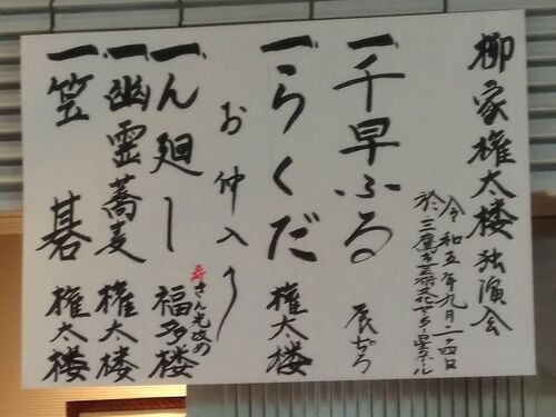 終演後に張り出された独演会の演目 柳家権太楼独演会が9月24日、三鷹市であった。 入場時に渡されたチラシでは前半、前座、今月真打ちに昇進した柳家福多楼に続いてトリを務める順番になっていたが、福多楼を飛ばして権太楼が「らくだ」を1時間演じた。 落…