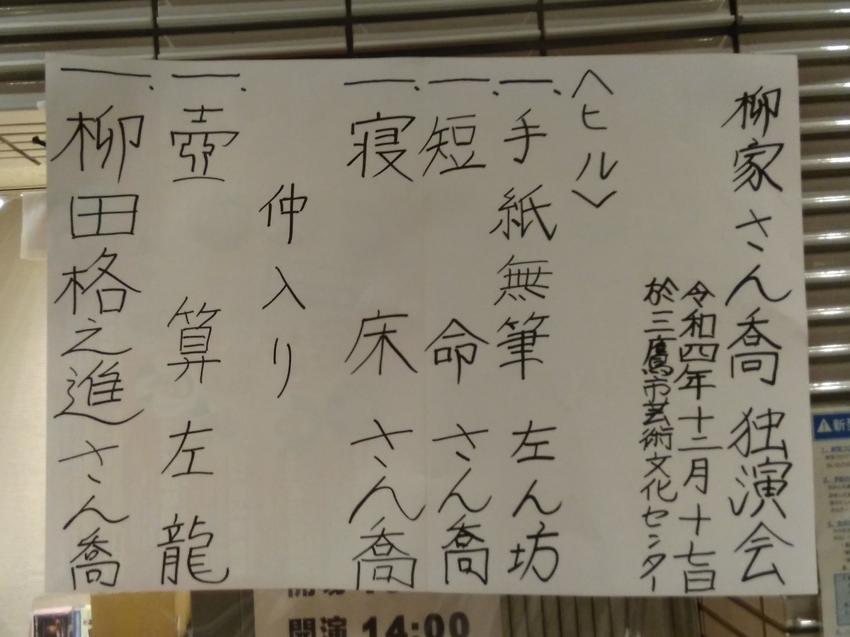 さん喬の演目は前半が「短命」と「寝床」、後半は「柳田格之進」。